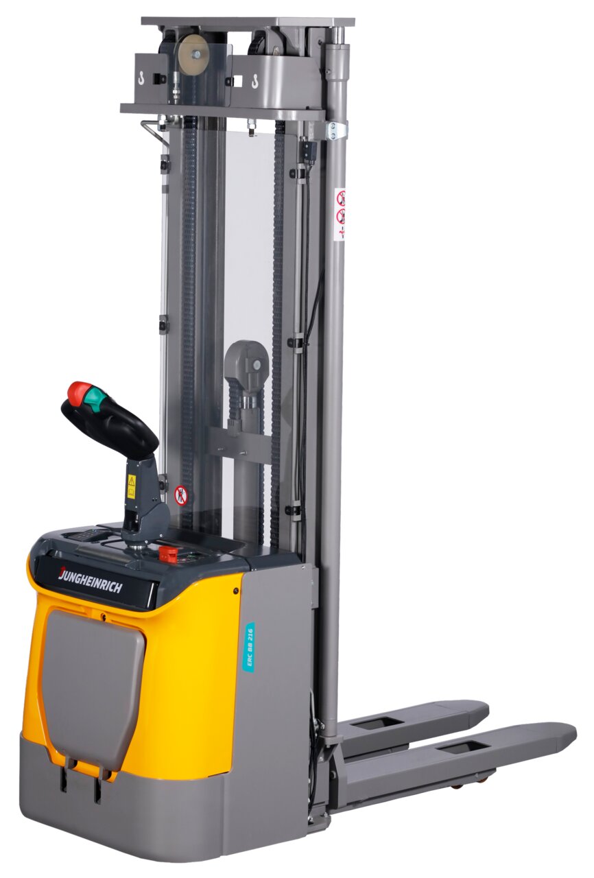 The efficient and versatile ERC BB 216 electric stacker is particularly well suited for economic indoor transport over longer distances, as well as for stacking and retrieval operations up to 5,500 mm. Equipped with a folding stand-on platform and support arm lift, it can be used very flexibly over long distances. The multifunctional tiller arm is intuitive to use and can be operated with the right or left hand. This contributes to greater efficiency and safety in your warehouse. The robust quality components are beneficial for reliable operation and lower wear and tear. Proportional hydraulics enable the operator to pick up loads accurately and safely. A variety of practical configurations greatly improve operational safety while increasing driving pleasure for the operator.
